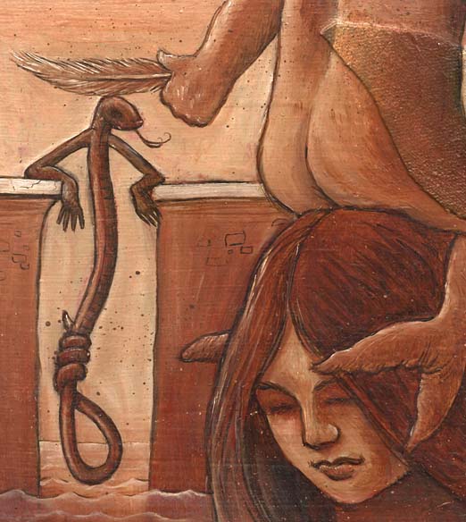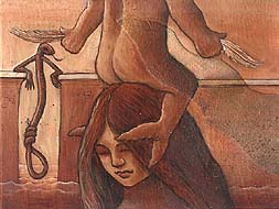 You were conceived in anger and you grew Leisha Wharfield, Eugene, Oregon (Half Drunk Muse) You impregnated me with your seeds Of anger, deceit, and ignobility. For thirty-five months I carried that labor of my love. My belly grew bigger. My pride diminished in its shadow. Til one day, the flood gates opened. My softened muscles tensed against the inevitable event; You were expelled. I now hold the ball of torment in my hands. How do I dispose of something that was a part of me? Courage and faith must preside. (Half Drunk Muse) Slippery and slick, baby was born He wasn't born hungry, he was starved For attention, for a caress, a single solitary coo From a dove drowning in the torrent. Left to fend for himself was baby, Chubby hands and spare tires hardened Into flippers and claws, His first tooth came in as a fang, There was not bottle for baby, just a jugular vein to tap. He rattled bones and wailed, this banshee in Pampers, A colic ridden dictator in the making. He was swaddled in the flag of a dying empire, was our baby, Crossed the Alps with his first step, sunk tankers on the Atlantic While he played in his bath, his scaly skin lavished with the oil Of greedy countries that baby gulped down whole, One for each reptilian finger and toe. His first word was Mine, His second was Take, His third was Now, All garbled together into a demanding fragment, But baby was never to be refused, baby was the chosen one, Baby was going to go far, baby was starved. (Half Drunk Muse) Sara C. Brockman, Madison, Wisconsin Decay of a Life Born to failure, earth deep. Binds the heart and seeks the contempt of others. There can be no diremption, the seed is sown. Circumscription bars the light, while cells split and duplicate the DNA of self-pity and visceral dissatisfaction. Suckled and nurtured through the umbilical of ignorance and apathy. The force takes on a life. Devised, formed, pressed, molded in the cerebral gray matter that tells us we are unworthy. Undeserved of air, water and light- while others bask and cavort. Maudlin emotions pass for life, when even a gullible smile is a miasma of petrified sentiment that grows and feeds the piceous soul. The end calls while misty shadows of life subsist. Death slithers and circles, biding its time, patient and steadfast in its devoir. But it will brook no refusals. Time has been given. The gift eaten in a slow feast but never savored. Save the scraps and spread them on toast for the last supper. All that is left is the leaden heart of one that never lived. Now, death will wait no longer. The last black breath of animus... merciless and absolute. (Half Drunk Muse) Donna Piazza, St. Clair Shores, Michigan Things would be easier, now, had there been some kind of event. Had it happened on a Sunday afternoon in a four-poster bed with the TV on in the background; or even if it had been a mistake. A mistake is a thing you can point to. There would have been evidence: a stain on the upholstery, a broken prophylactic. We would say somebody came inside somebody else and drama ensued. Stories like that make sense. They happen all the time. But things were more complicated (of course they were complicated) and whatever happened happened in the dark. Who can say, now, who spoke first? Who dove in? Who watched from the sidelines with night-vision goggles, timid and wrapped in a sweater? And now, a period of gestation. What are we waiting for? Fruit or a monster? A monster, for sure. Some ancient-looking thing. Some freakish amalgam of parts, born with a full set of teeth and two or three types of privates. (Half Drunk Muse) Mother, O Mother do not despair The fate of a child your prior choices will not share Though its existence may have be conceived through sin The choice is yours, the choice to win The serpent of death and worldly distress Will not touch such innocence unless from motherhood you retire The stench may always lurk drawing it to dreadful work It's appearance at times may remind your past hurt Mother, O Mother do not despair This evil you will capture before it can show its sinister glare ------------------------------------- It lingers close by watching its progeny grow, waiting for the right moment to pounce drawing such innocence to a life of distaste. Silence may echo but the stench screams. A child resembling such a horrid scene. A mother's distress of what she feels was a life's mess brought to haunt her yet console her. A love, a fear, an unforgiving torture. A life spent guarding her precious from the serpents of the world. -------------------------------------- Sly little devil wrapped around its prey. Sly little devil wishing for its treat today. Dragging new life beneath its nasty grin to a world down under - a world away from the precious wind. A mother distraught by the knowledge of what is around her, but a child is engulfed in its own hungry. Upset not by what may strike him but rather the need to fill its nature desire. Ignorance can be bliss but with knowledge one can protect its kin. The sly little devil grips all he can capture holding tight and fighting to be the one to nurture. (Half Drunk Muse) The serpent hangs on his moment, tail a noose of bad news. The time to ring his dissonant unity slides through the waves below. The baby, fangs for the memories, has a bone to pick with being reborn into times as fishtailed and side-scaled as these. Any breast that feeds him will bear long wounds. And whose fishtailed buttocks are these escaped from some Anatole France nightmare and sitting on the mute brunette Madonna who must bear all interventions and inventions for some long-gened trespass against things' natural order holding two feathers to outbalance any heart in the weighing of justice? -John Oughton, (Half Drunk Muse) “Sit on my head so you’ll hold your self high” said the nurse to her crown, a child of infinite love and affection, a child of peace and of hope…if only her own blood could be so perfect. Atop her mighty figure i