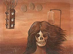 Behold the Varsity Virgin with a pair of out-of-fashion sneakers and a Colostomy Bag dripping behind her like spectrally virulent syphilitic sign of the Living Dead (phallic building burns behind her like a feeble replay of an over-and-done B-Hollywood-action flick). Beneath her foot is the Microscope of Unoriginal Sins, ceaselessly measuring and meticulously recording all the cliché iniquities, the habitual tic of criminality, rape, murder, and enslavement that the Rulers have visited upon us in Bad Eternal Recurrence like a fierce Locust of super-nauseous Halitosis. All of us, Exploiters and Exploited, are to truly Know this Skeletal Virgin, as the Trickster Creator once commended Adam, Eve, and the Serpent to do in an Ugly and Unholy Orgy that produced our fetid seedlings.