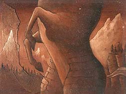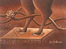 | Kitsch The stallion poses no threat for he is blind. His hoofs are firmly imbedded; for good measure is restrained by a single rose, posing no threat whatsoever. Yet we see only a glimmer of man hiding within the statue afraid to be honest with those who peer at the depiction of this refined and restrained powerful creature. The artist illustrates the ultimate kitsch by mockingly portraying a fearsome rearing steed in a stylized manner then he discloses envy and embarrassment by placing man inside the statue. Mankind reacts to the unusual by proclaiming it "kitsch" instead of honestly taking ownership of his most inner thoughts. Dr Dennis Myers, Laguna Beach, California Kitsch Between the gory mountain of hidden souls, and the cursed Valley of the Kings, stands statue like the doomed, the blind, the turned once unicorn called Kitsch, daemonic thing. Once a soft magical creature of silver hue I heard, until it wandered mistakenly into No Man's Land and I feared it lost to the devil's will, my word!. And the shape- changed beast gave a stutter and swallowed whole the man, to spit out hot blood and something else, in the worst fight, as only the terror Kitsch can. But man had a spirit that stirred ,from the confines of statued beast. He peeps, he waits, he groans, he fears until he's done his task so neat. True his spirit longs to see who is at the gate or beyond the mountain trail but one day a Don, a good Quixote must come to sort out the multi-horned beast of hate. And the coal-black heart of the Kitsch the Don will sever from within, to free man's spirit then banish the Kitsch because of mortal sin. And in the time it takes to happen, the mountain's shift their peaks, the Red Rose also creeps along, steady and through, between the legs of prancing, frozen statue Kitsch. -Cleveland W. Gibson, (Author of Billabongo) Faringdon, Oxon, United Kingdom |