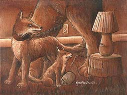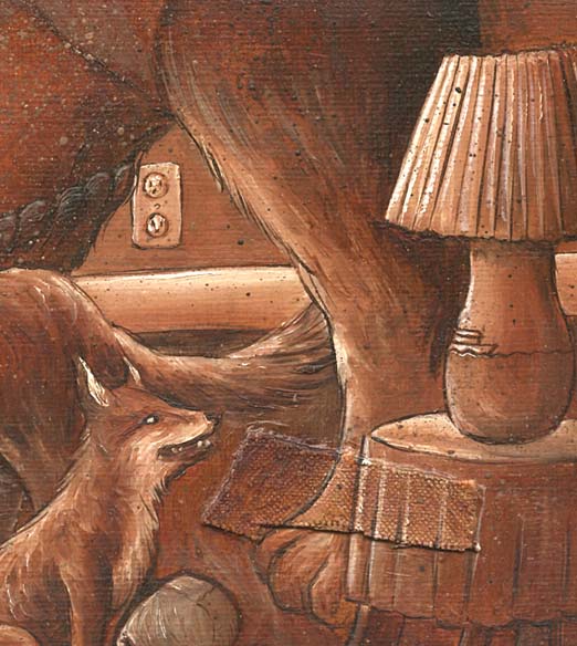 | Pedigree "... I really like the naive quality of the drawing. I think it makes it feel like a parable out of a political nursery story book. The division into three panels is brilliant!"- Kenney Mencher, (Artist) Palo Alto, California Pedigree I keep waiting to comment, because I feel I am trying to read too much into it.. and I have the sense that it's there. I have an idea of what I think the piece is about, but it's not all coming together for me..or I'm trying too much into it. Maybe that's a good thing. I'm not sure if I had mentioned this in the past, but I like how these pieces look like they could be interchanged with the other [triptychs]...The division also allows for a focus on the parts as well as the whole which invites a longer searching of the painting. To be critical, I'm not crazy about the color. On one hand, I see how it ties the different totems together and creates a sense of unity. Yet, I'm just not that fond of the brown.. my personal preference..." -Dean, (Art Crit) Boston Pedigree "I have to say I really like the color. The first thought I had was Alice in wonderland. This reminds me of the art work in the book I read as a kid." -Kelly Caldwell, (Digital Artist) The Art Crit Pedigree A shout echoed around the land, across the Castle, London Town, Buckingham Palace and the Tilbury sand. ”Who will walk my dogs, my pets,” the Queen, Her Majesty Elizabeth was heard to say. She looked around, looked distressed as the official walker of the animal was sick with flu that day. From somewhere in the gardens, perhaps just past the trees, the perfect Persian cat rose up, pumped up chest with pride, and dusted down her fur and knees. The cat called 'Mona Lisa' took the lead of some Royal mutts and quickly did a strut, past the soldiers on the gates, past the 'Green Man' pub as if it were too late. Then the mutt in front played up enough to send Mona Lisa into a spin as it knew this was something new and wondered what would begin. Others looked around as if a sound caught them unaware and really wanted only to rest with beer, table lamp and an old rocking chair. But feline Mona Lisa drove them on with her will of sharp Sheffield Steel and the Queen Elizabeth , in all her wisdom, thought the cat had done a good deed. Well , worth an honour, a medal for all to see, and see it many did. The Official Watchers watched as 'Mona Lisa' walked the dogs from Tower Place and Cutty Sark, the tall ship. And Mona Lisa did fine that day while the real walker coughed and stayed in bed. “A day to remember PEDIGREE or where we are from,” the kindly Queen said. ”It that elusive stuff inside that is worth far more than gold. Remember it well. I do, as this is the only CAT to ever do as it's told. Hurrah for Mona Lisa. Hurrah for true worth. ” -Cleveland W. Gibson, (Author of Billabongo) Faringdon, Oxon, United Kingdom |
