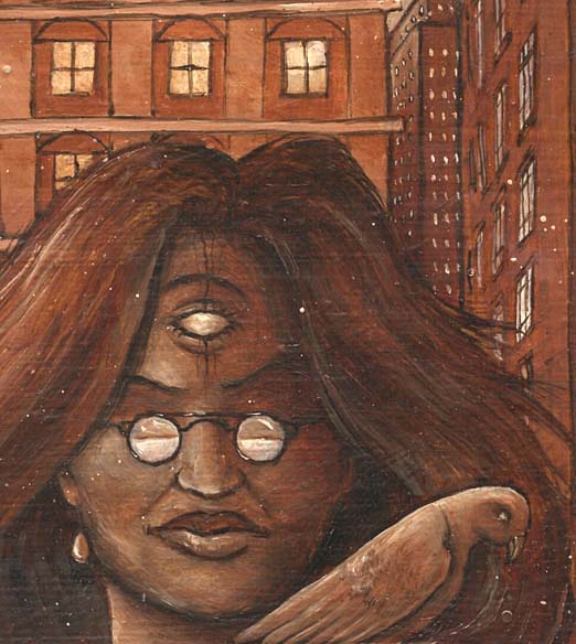 Once my tender heart beat openly on a bony shoulder full of hope and illusion twin carrion ready to peck the glitter from youthful eyes vulnerable in the crucible of dreams I gave freely milky liquid rushing down mountains of smooth skin the air was icy but I didn't feel it my offerings were bold and you took them coldly between greedy fingers your hunger boundless a worm in my intestine foolish simple host When the food ran dry my lips curled as I donned the legal garb of your addiction the bullet proof waistcoat briefcase and dry words y ou held in such esteem I was untouchable the freedom I lost chained to the graveyard of your desk caught between corporate babble and the ticking clock seemed a small price I was wrong Under the chainmail wasteland of ego and paper a woman's heart still beats my third eye suspended in animation waiting patiently a future that has already arrived if I loosened my tie, cut the ropes, dropped the box would the world end or begin? Magdalena Ball, Newcastle, NSW, Australia, Compulsive Reader Estrogen My cup is broken, it's never filled. . . and these eyes of mine, they play blind. Behind these glasses I wait for the day I can be seen, the day I too can see myself. I've been trying and trying on this ladder of 'be all you can be'. The world beyond is presented with great sight. For now I shuffle in my open for viewing brief case and place on my stockings. This mighty net I've found myself in. This only makes me want to try harder. I want to rip from this foundation I have been anchored down to. I'll change my style, I'll change my attitude, I'll make it a point to be heard. If you can't beat em', join em', just for a small amount of undetermined time. While I stand in the shadows, I learn. And with this wisdom, I can do anything. I can fly. Tina Carrigan, Richmond,Virginia Estrogen: Mind’s Eye I see more clearly with my mind’s eye the meaning of peace Though the world seems to have chained me in to one place As obscure as the world around me may become in my eyes I will still be aware of the treacherous and tedious fine lines Has it become too difficult to prescribe femininity to the world? Or have we become conformists pending decency for the girl? All this and more has become clear behind the broken lies When all that I know is subjected to the scrutiny of my mind’s eye We feel as though we have become too great when pertaining to this Have we achieved equality or are we merely feigning all of it? Softly spoken sophist muttering something of a different tune of jest Was there a reason for our bleating to uniform the blessed? Sick sadistic motives seem to float like wind as it blows What hides behind those secret frames, behind the windows? Might I ponder for a moment if you were anything like me? Though if it were so than I would think this a catastrophe When the thoughts collide in my own mind they seem to clatter Only soon I realize that my dreams have not been shattered As though reaching to catch the highest parts unknown to me Though as miniscule as those hopes certainly now seem to be I can not simply disregard what I might say that I know That I certainly must admit that the true nature is not shown Yet despite my writhing anguish in this business I’ll be fine But I might never ascertain the true meaning of my mind’s eye Christopher B. Hopkins Albany, New York Estrogen "Maybe I have to break the ice on this one. This painting(s) takes on an issue which certainly can trigger responses. A women in typically man’s clothes, with a tie, and she’s tied down too! What to make of this? A critique of the working woman? And why the 'mind’s eye'? Does she have real eyes? What's the significance of the girl on the ladder? I ask not to have the artist answer, per se. Just interested what people think." -Dean (Boston) The Artcrit Blogspot Estrogen "Wow, I just saw this artist's website. Very impressive. I love his puzzle-to-discover-every-detail paintings full of wisdom. This one, for me, is about how most "women lost their feminine essence to fit in a "men's working world? She used to feel inferior before, and now that she is in this 'men's world' she can feel succesful. Even. The little girl, is herself, before. Is it about 'feminist women'? She's tied up cause she can't fly if she's pretending to be a man and that's why the 'third eye' (wisdom) is blind. It's a funny subject to me. I've never really pay attention to this matter. I really like his paintings and discovering every detail. It's like every painting is a little lesson." - Romina Diaz (Buenos Aires, Argentina) The Artcrit Blogspot Estrogen "I waited for responses...because it just plain bothered me. I know that means it's good art. It evoked an immediate response. I am a working mother, no blind eye here. Goodness I could use a few more, and I wear men's clothes daily...I just didn't identify with it. I supersede all those symbolic stereotypes, but I can appreciate the skill, the talent that created the work...very technically wonderful, evolved. But gut reaction was negative, like overhearing a racist joke in a passerby's conversation...weird. It's not that I hate the painting, not at all. After thinking about it I came to the conclusion...I think it's more that I hate the stereotypes that he has shown all grouped together in themselves. It's ugly to see the world thru stereotypes. That's the reflective quality of the glassess. But that's good art when you can take three days to decide how you feel about it. Art is subjective, this one is introspective." - HMBT (Oregon) The Artcrit Blogspot Estrogen "I just think it is funny, he has this wit quality to be able to capture that 'silly human nature' and draw characters in a creepy and real way even though they are cartoonish." -Romina Diaz (Buenos Aires, Argentina) The Artcrit Blogspot The train at the station gets away in a head of steam, taking with it the captain of industry and these days his moll,his girlfriend and his fancy queen.