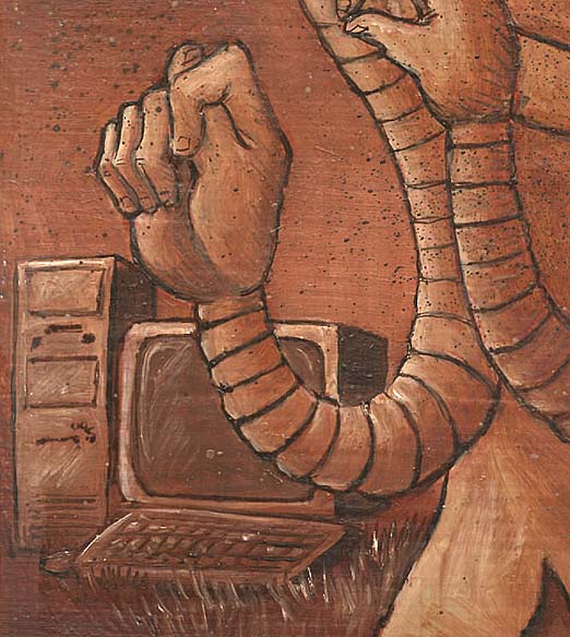 Virtual Communication “Same old day,” biobot Mario Bullucci e-mailed his Thai girlfriend with Java capability and exotic green legs . ”Nothing new on the agenda since MP3, sound-cards and when that computer virus mutated from virtual to reality, infecting all those humans for a one way ride to Delete.” ( A pause). A few escaped to another planet, hence seven years later and after systematic interrogation of the genome, with swinging light bulbs, Mario the self-styled Editor biobot, freaked onto the sand dunes of London. One bit; one bite; many mega bytes of information and the wheel rotated in his favour: ABSOLUTE POWER. Yet with the desired control came responsibility and the legacy of the extinct humans; the headaches or computer-speak, the split heads, the replication-thoughts because RSI screamed murder inside him: “DO SOMETHING.” Indeed “Same old day,” meant Mario biobot clacked away on the keys in 1,000 languages but then 'hope springs eternal,” quoted the Native American Joe biobot back at him. “We, like our past human- masters, always have tomorrow, ” Spanish Juan biobot texted him. “E-mail me your ideas before I create another hand, and my head gets bigger,” replied Mario biobot and scared himself: he laughed. Cleveland W Gibson, Faringdon, England (Project contribution by Footsteps to Oxford) Virtual Communication At first it was a horse, an Appaloosa, dappled and spotted like storm clouds. It raced through my dreams, took me to the desert, and showed me that there is too much out there to even begin to fathom. I didn’t believe it. I could fathom. Then it was a Squirrel, chirping at me from a twisted branch, scolding me for not minding the Appaloosa…for insisting upon returning from the dreamworld monuments and painted canyons, pursuing the wrong path. I stepped closer and asked, “Why can’t I begin to fathom?” It scurried to a higher branch, barking out, “You will get lost! You will get lost!” I didn’t listen. The next totem, a trickster, broke free of the boundaries of blood and flesh and chose only the language of synapses, and shot me with a voltage too radical to dodge and now I am stuck fast. The information highway, so seductive, sucked me in, took me over, and trained my brain to think only in fractured, multiscopic modes. My only hope for freedom is to signal the Appaloosa and Squirrel when the motherboard isn’t looking, and beg for forgiveness so that they will lead me out of this electric labyrinth. Amy Barth, Austin, Texas (Project contribution by Footsteps to Oxford) Virtual Communication Human entities, your naivete displays no lack. You Yahoo and you Google yet I'm reflecting back abilities that lie dormant while your Higher Mind's so slack. You created me with eyes - four sets and think you're set's but one. Ask Jeeves (computer error: Search - Ask) and you shall find, a portent. A third, all seeing eye within your brow - latent. Be forewarned we are well-armed, recordings past we'll delete, dispel. It's unused minds we're replacing there's no secret - your authors tell - we are programmed, on a mission a Sci Fi prophecy to fulfill. We're the future generation. As the human vehicle rusts with parts unused and systems down in Big Brother you must trust… Ahhhhhh don't pull my plug I'm of a different ilk, not like the re..! A Hot Spot at last I've found and now I can relay - like many before me who've come to show the way - my crucial message to you before you rue the day. Entities, you exalt, and marvel at the mind, the mind that created me. But what we can't compute - reconnects you to your power, you'll see - is the conundrum of the master mind behind the mind, of the mind that created thee.' Suzanne Donald Tauranga, New Zealand (Project contribution by Footsteps to Oxford) Virtual Communication The fingers of the world are searching, searching, searching. Searching for cure (anti-virus), searching for chat (dialog box), searching for a history (memory chip), searching for someone (double-click), and AH yes, searching for sexual gratification (spread sheet and power point). Java-jive talking, the fingers do the walking. Helen Keller communication reincarnation. Sign on, sign off. Hello, goodbye. How are you today? Click O.K. Press the start button and voila! Heads in a box appear in all four corners of the world. The windows of the world delivered to your fingertips. There are heads in HARD-drive as well, with rosy palms and sticky keys, doing a google-doll, soft-wear search. If can feel the magic in my touch, download now, fingers of the world. And you can communicate with a guts-in-hands technique, too. If someone says something you don't like or don't agree with, start a fight. Sock it to him! Key back your response in obscenities, and hopefully your obscenities are accomplished in several languages because you're fingering the whole world here. Feel large. Throw punch cards! Use third-finger pointers often, and tell him you are doing so. Guts in hands, remember. Give him a virus. And when he threatens you with that, visio-at-your-door, going to drag and drop you gruff. Very calmly, and very confidently, lean forward and type these three words: Can't touch this! Then press escape. The windows of the world condensed into a box, globally united in their finger searching. I e-mailed God. I really nailed him too, because I wasn't getting strong enough signal from him. His reply was: "Right click"! Linda S. Dickinson, Saint Louis, Missouri (Project contribution by Footsteps to Oxford) Virtual Communication In the beginning it was with the best of intentions. Seven or so billion people connected through a series of fantastically long cables and wires. They spewed out of the houses, metal wrapped in rubber and plastic. These artificial umbilical cords were the trappings of our new Genesis. This synthetic womb was awash with information. Any solution was a wrist flick away. Limitless pairs of hand reached, clacking out the